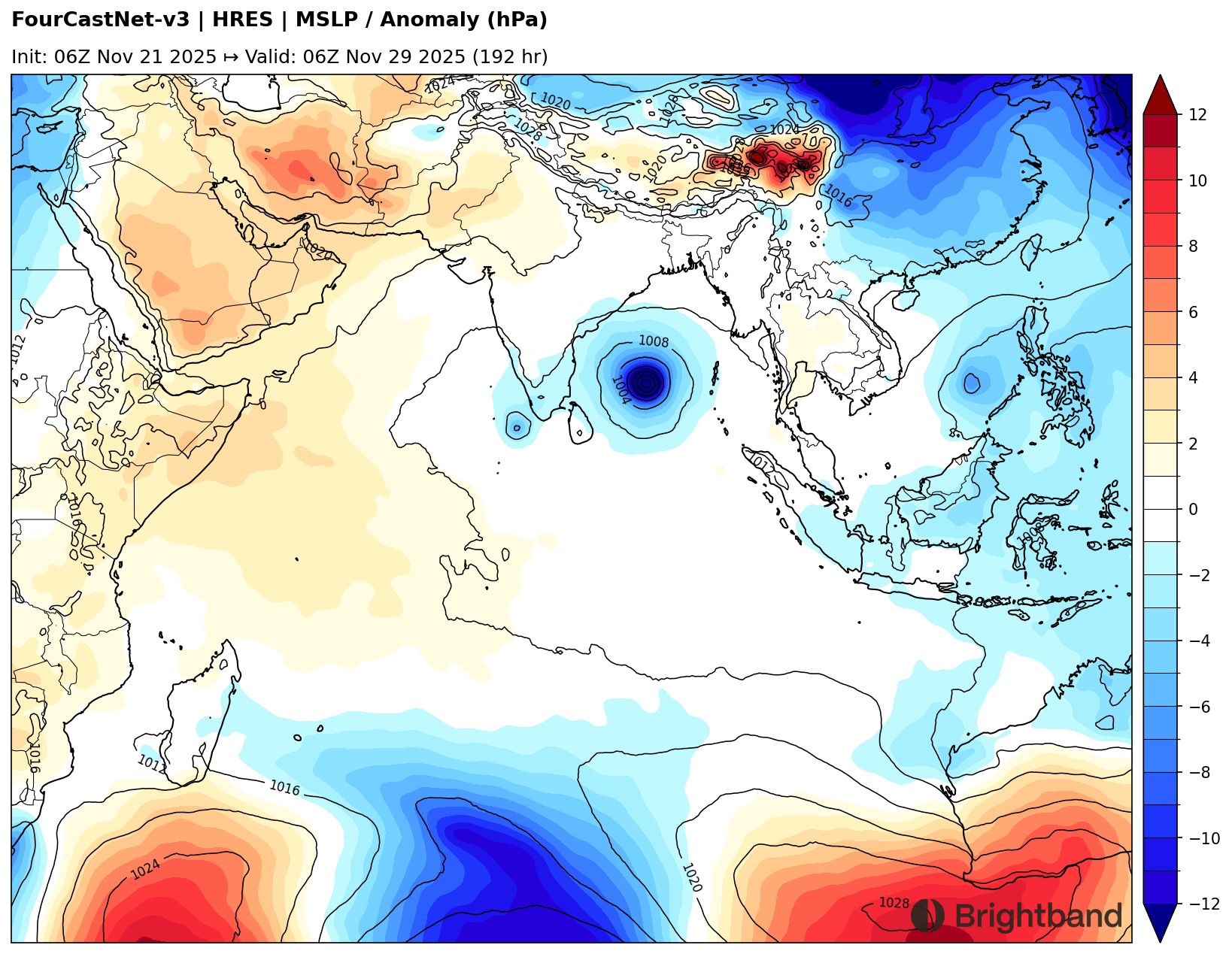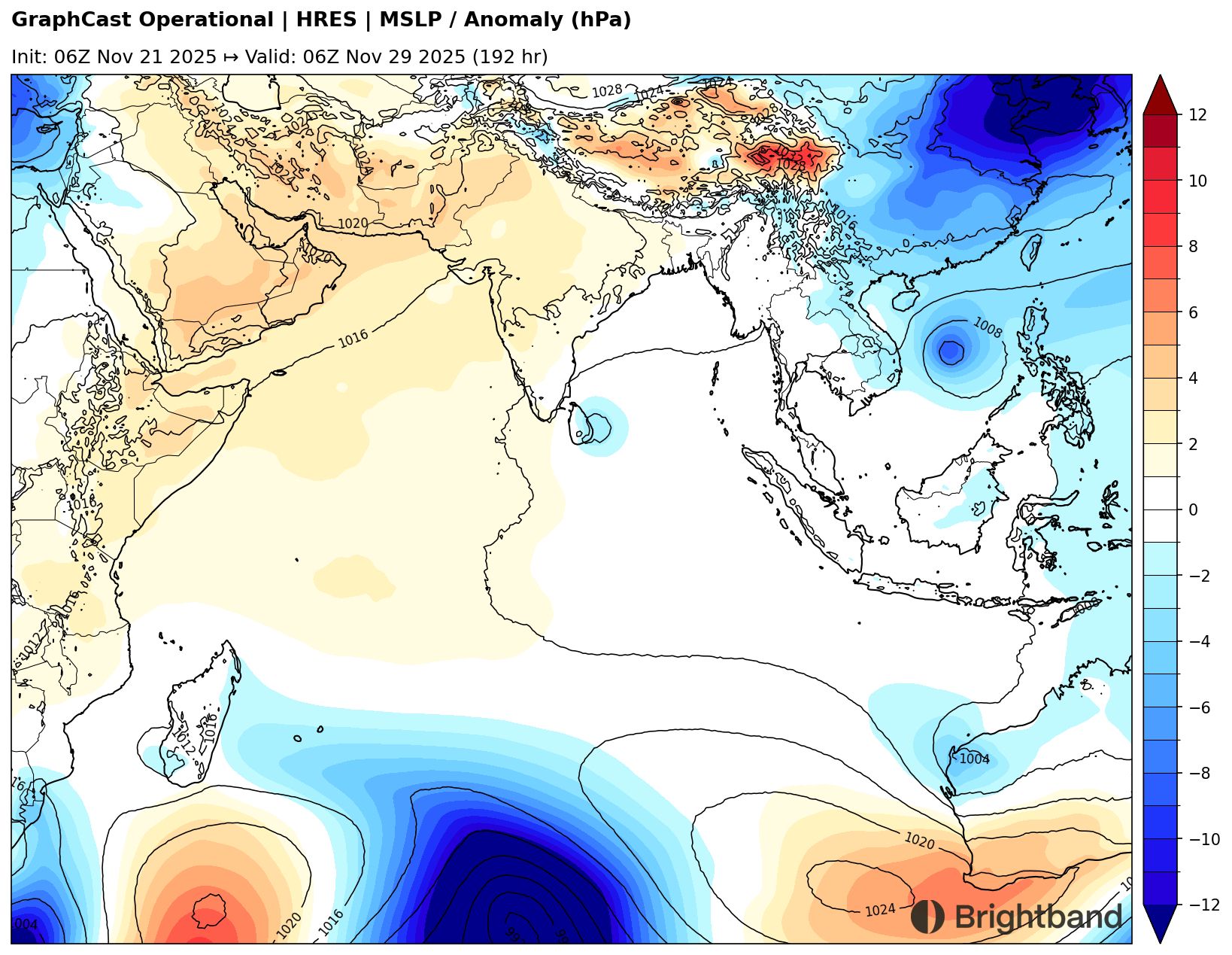 Looking at the fields from individual AI models, we see examples of both solutions. FourCastNet-v3 (Figure 6) has a small low near the southern tip of India, but turns 95B into a strong cyclone in the Bay of Bengal by next weekend. On the other hand, GraphCast (Figure 7) just shows the weak system near Sri Lanka. Such uncertainty is common in the early stages of developing systems, so we’ll see how things trend over the next week or so.