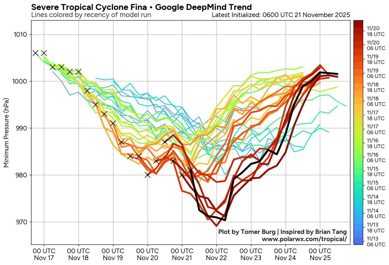 Interestingly, this is a case where DeepMind actually missed some of the recent intensification in its earlier forecasts, and has had to correct stronger, as seen in the intensity trend plot from Tomer Burg (Figure 2).
