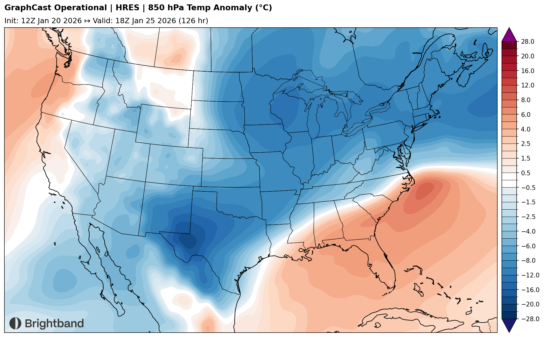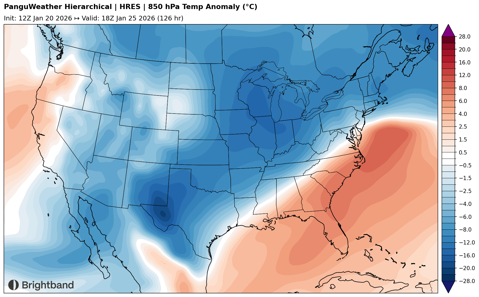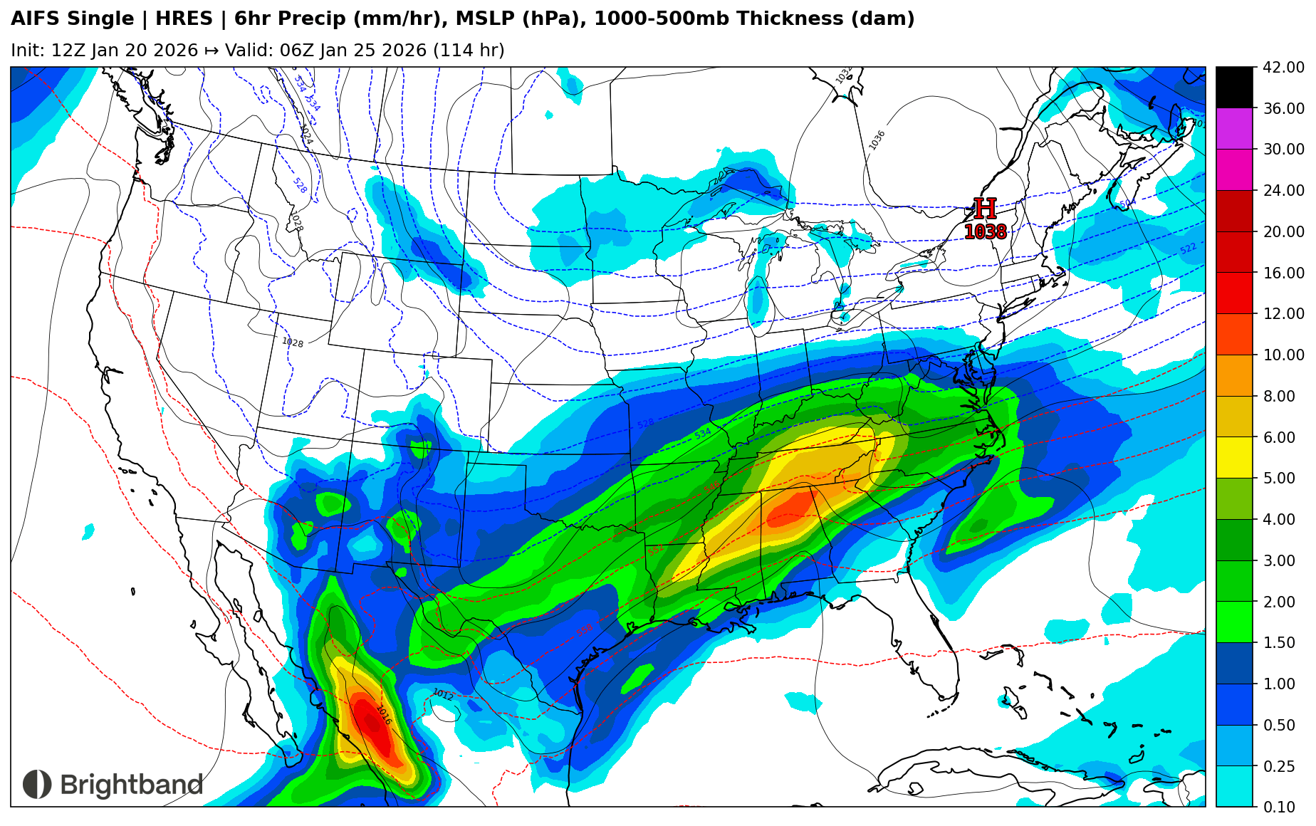 Other models have a stronger ridge and larger warm sector across the Southeast. For example, PanguWeather has a warm nose extending to the Appalachians, which would reduce snow totals but increase the risk of ice across the Carolinas and Virginia (Figure 6).