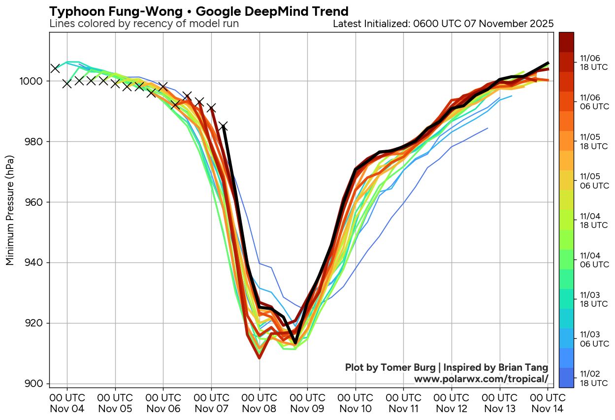 Figure 2: Pressure forecast trend from Google DeepMind for Typhoon Fung-Wong. The more recent cycles are in the oranges and browns. Figure from Tomer Burg.