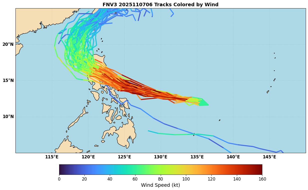 Figure 1: Google DeepMind/FNV3 forecasts of TC track for Typhoon Fung-Wong (shaded by maximum wind speed) initialized at 06 UTC November 7, 2025. Data from Google.