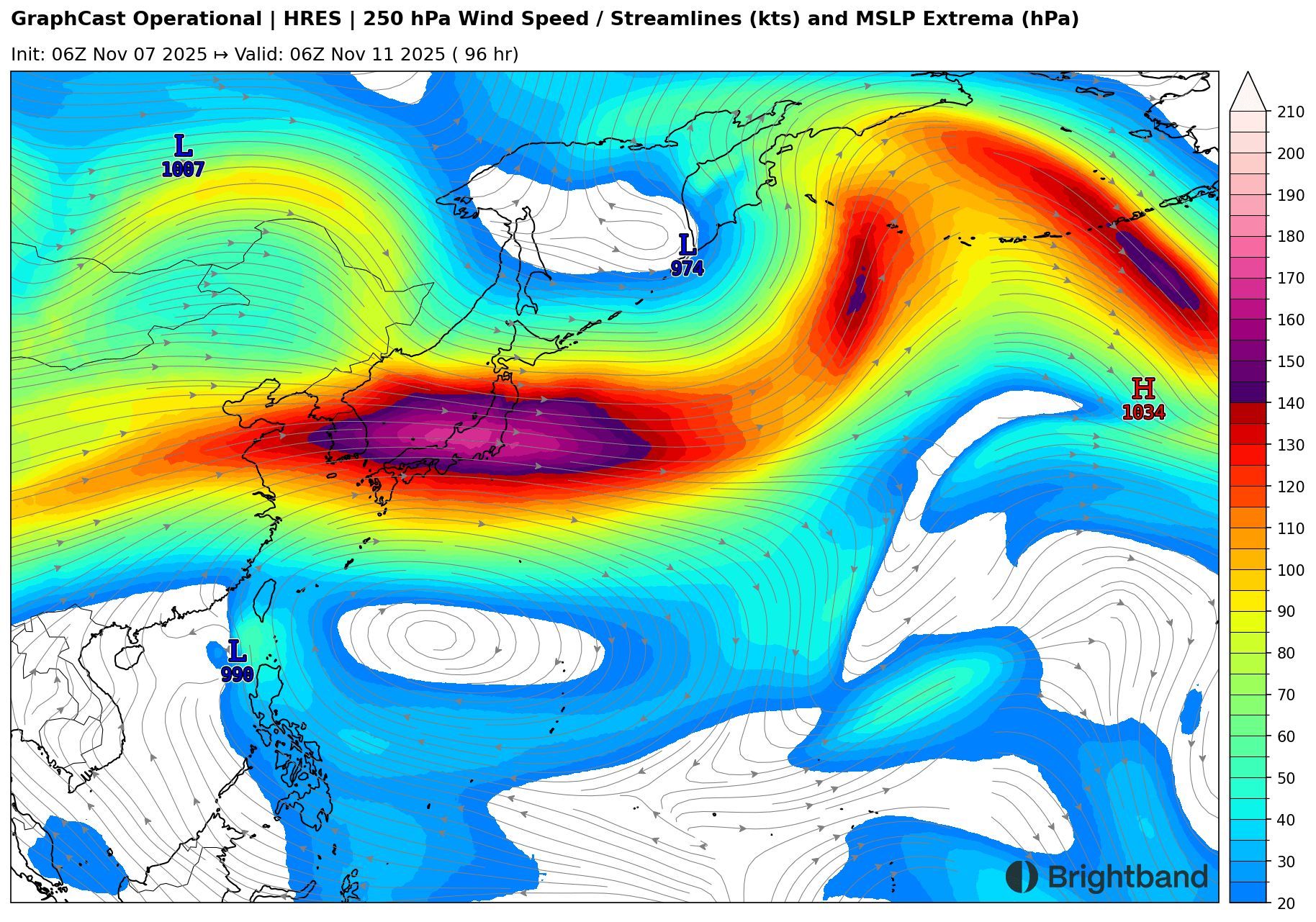 Figure 5: GraphCast forecast of 250-hPa wind initialized at 06 UTC November 7, 2025, valid at 06 UTC November 11, 2025.