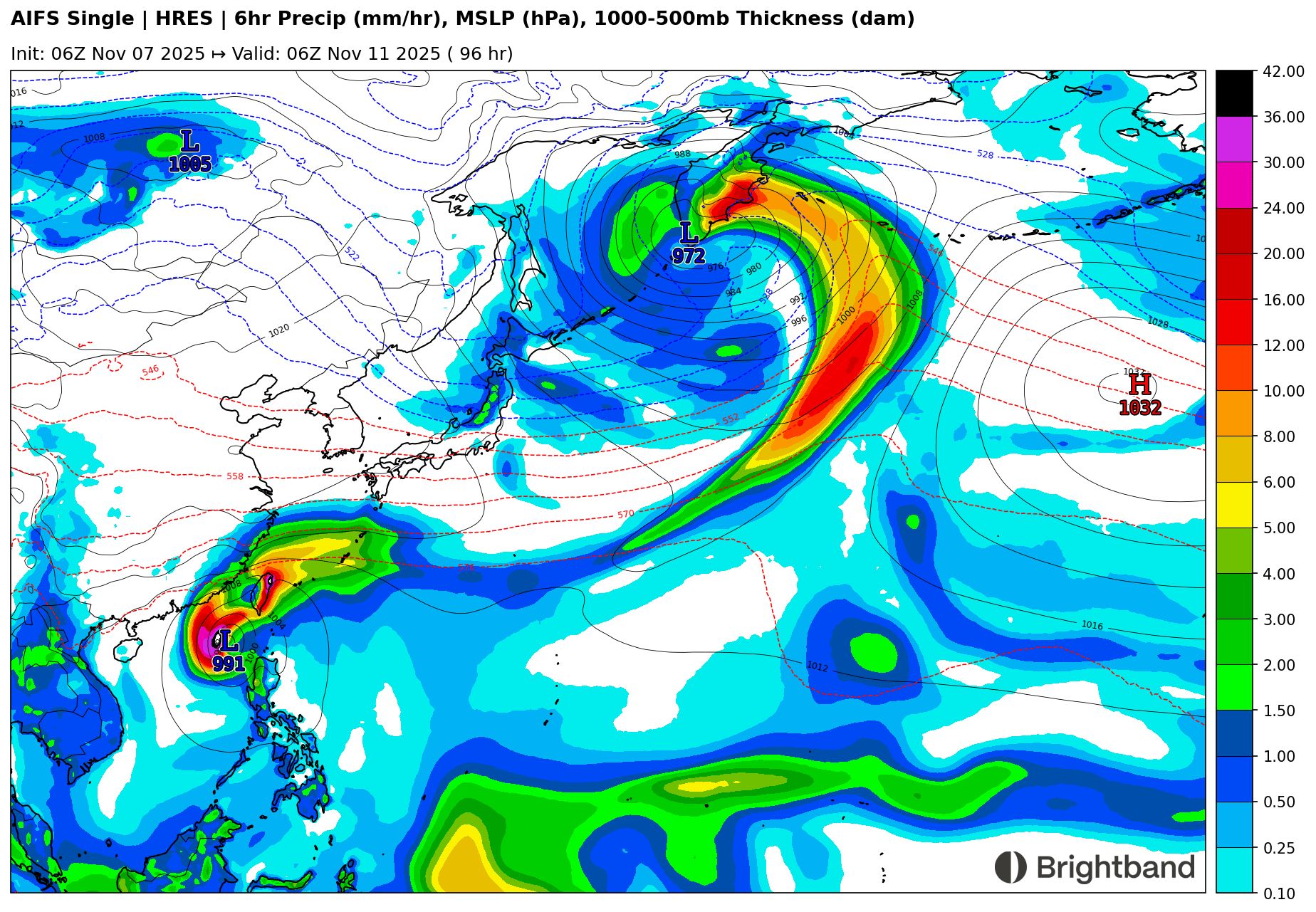 Figure 4: AIFS forecast of 6-hour precipitation, MSLP, and 1000-500 hPa thickness initialized at 06 UTC November 7, 2025 and valid at 06 UTC November 11, 2025.