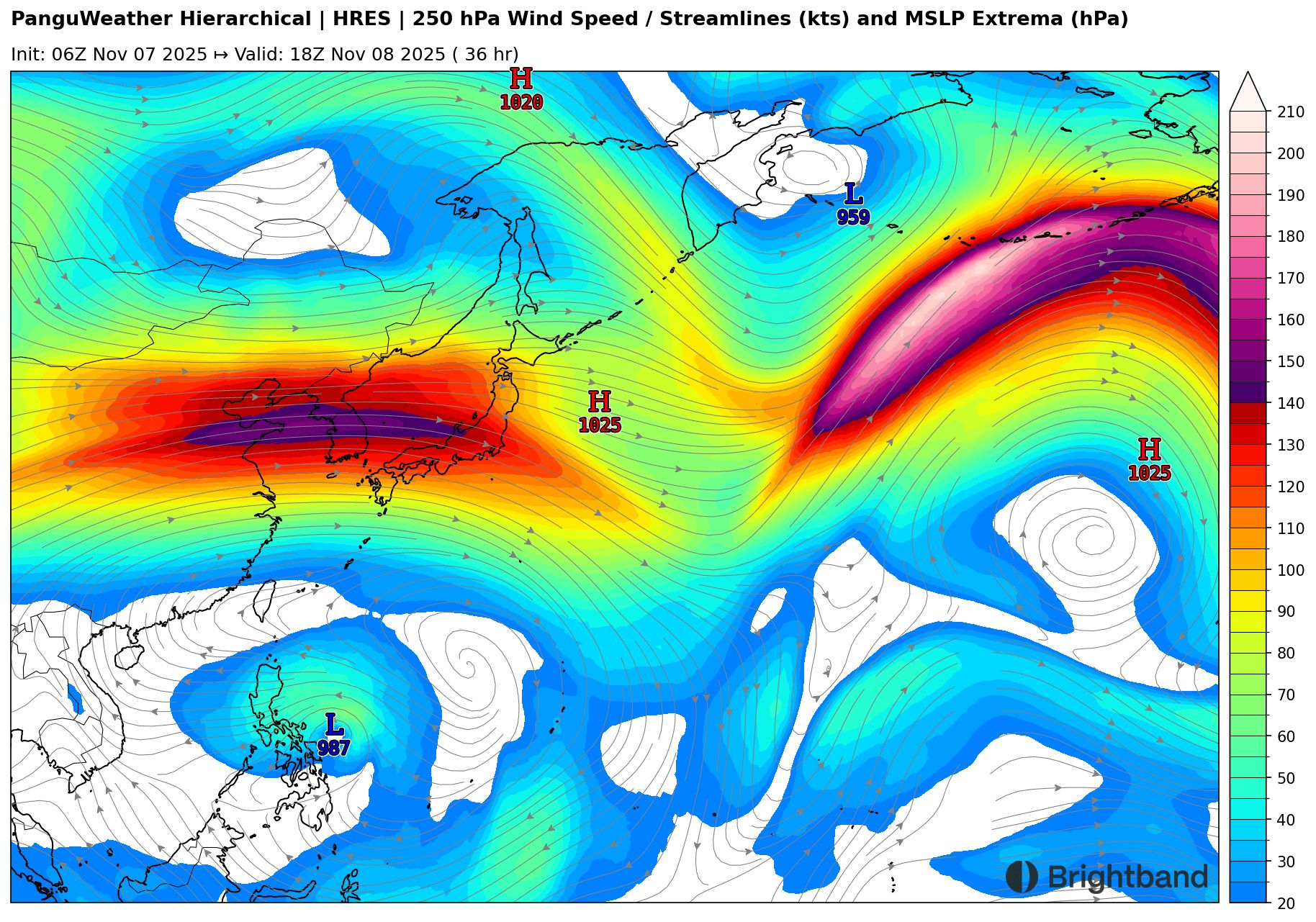 Figure 3: PanguWeather forecast of 250-hPa wind initialized at 06 UTC November 7, 2025, and valid at 18 UTC November 8, 2025.
